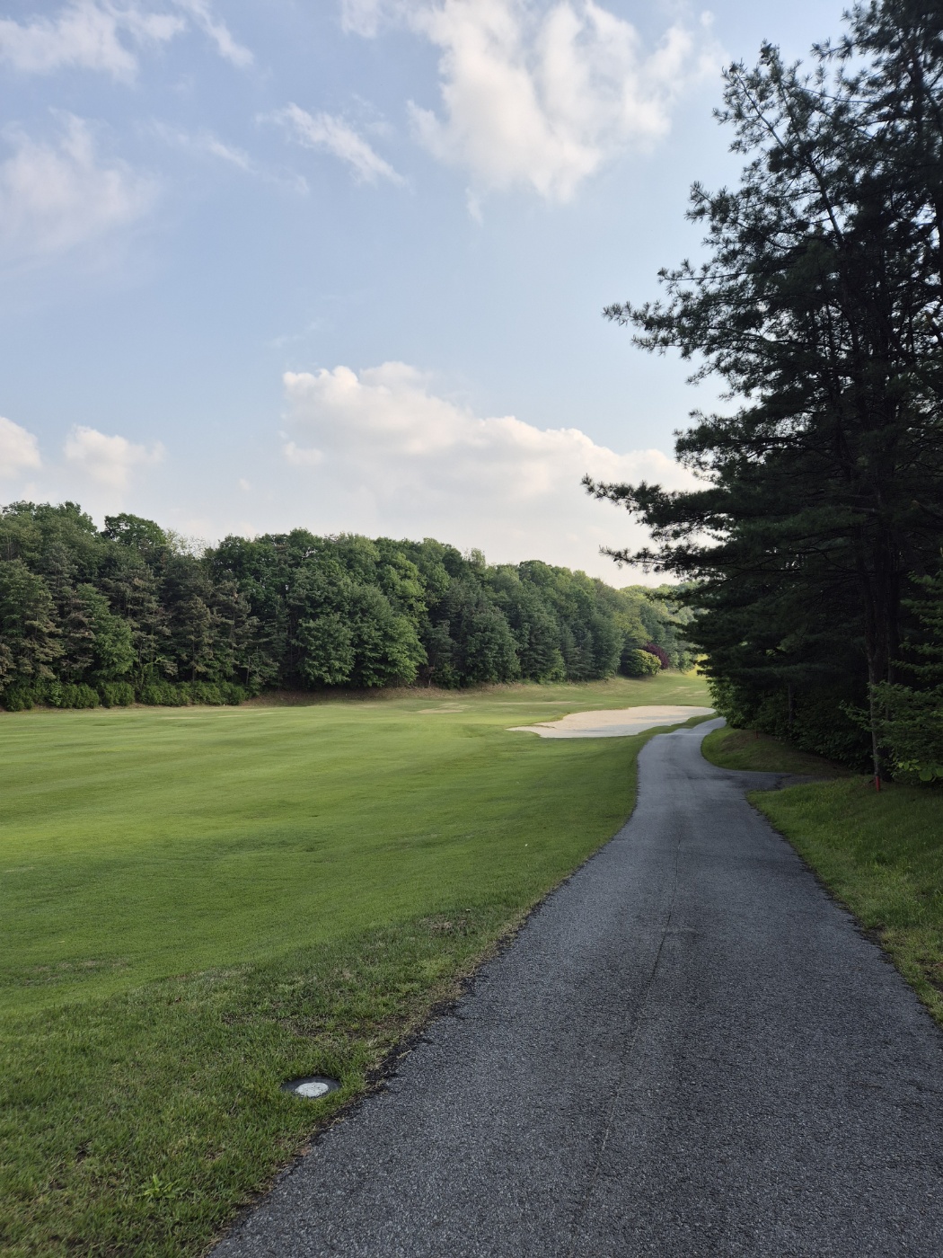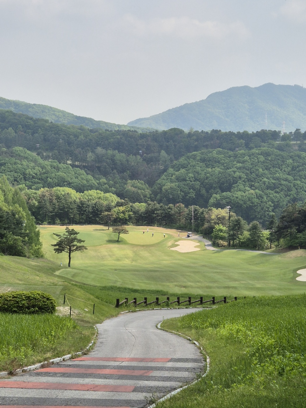 멀리 펼쳐진 코스와 그 사이를 누비는 골프카트 길.