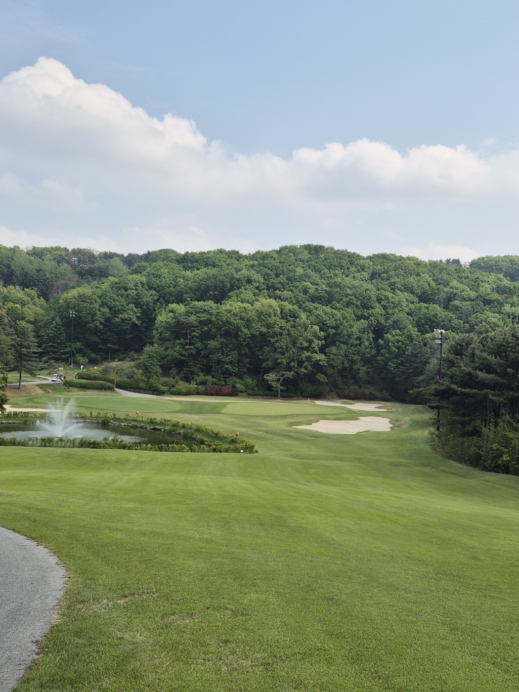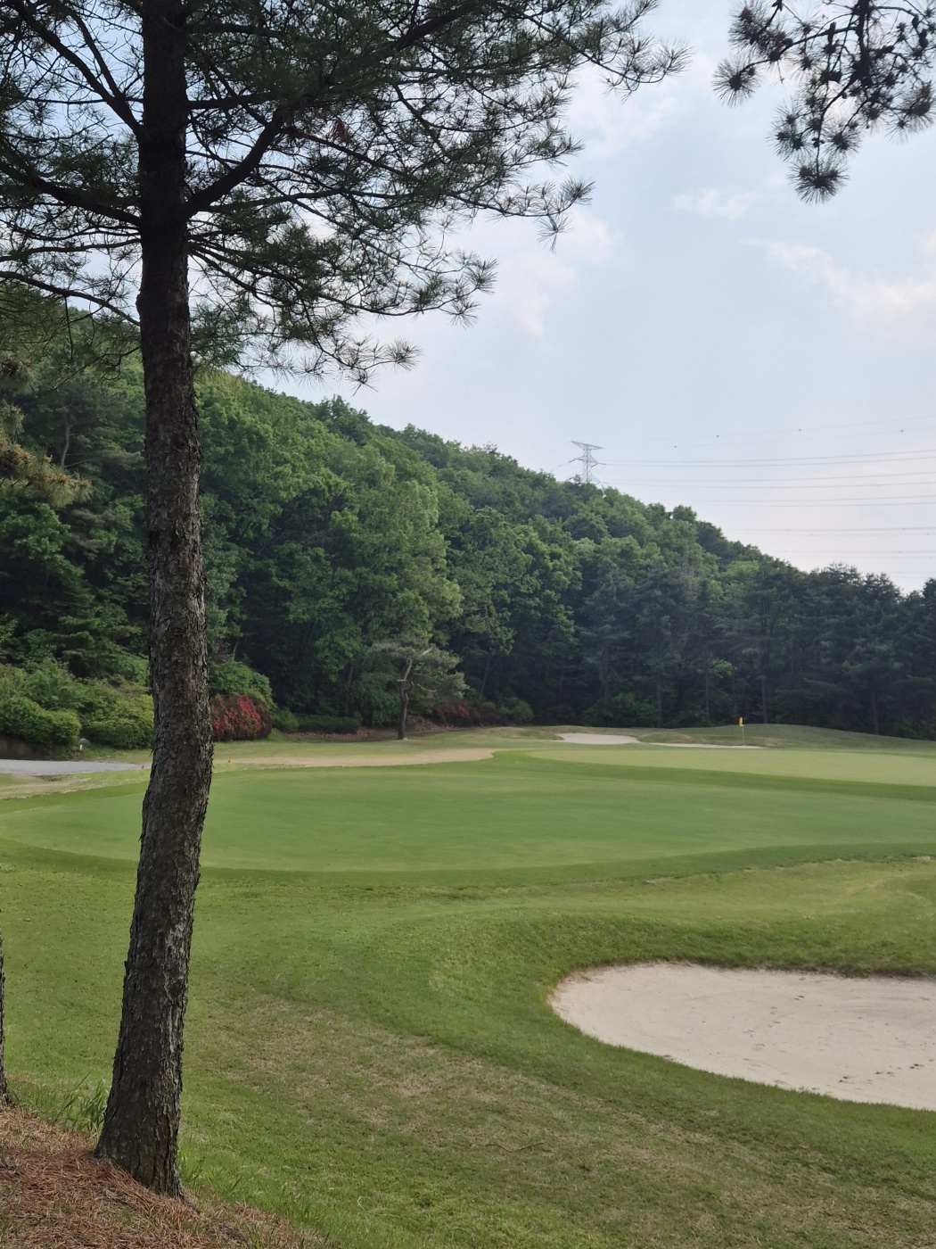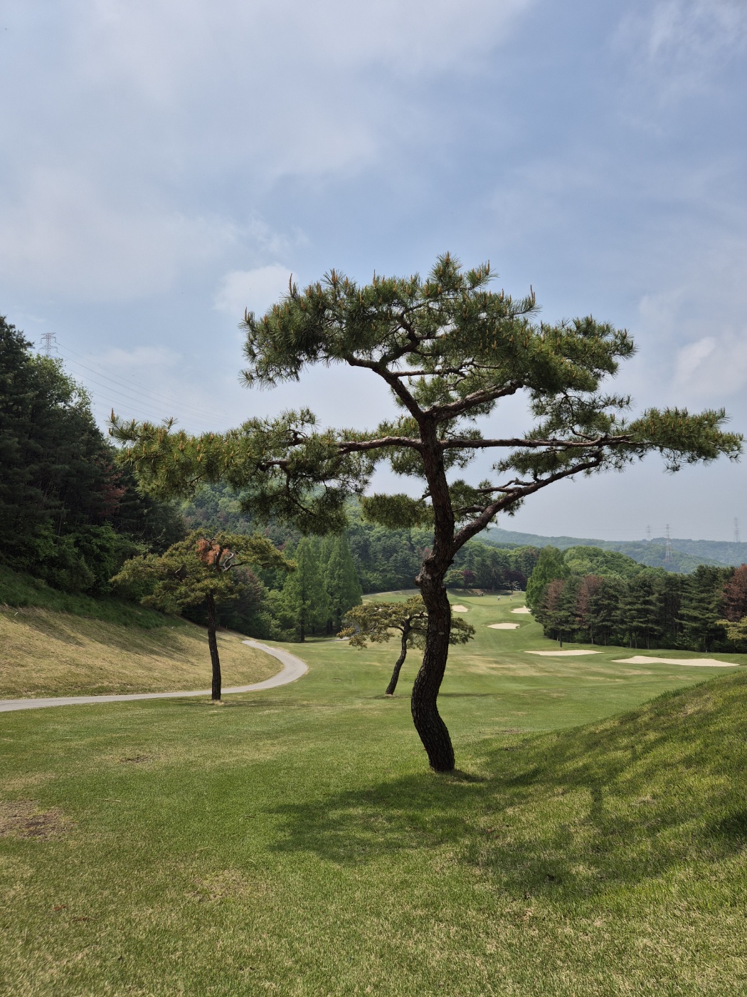 완만한 경사와 곡선으로 이어지는 페어웨이, 그 위에 점점이 자리한 소나무들.