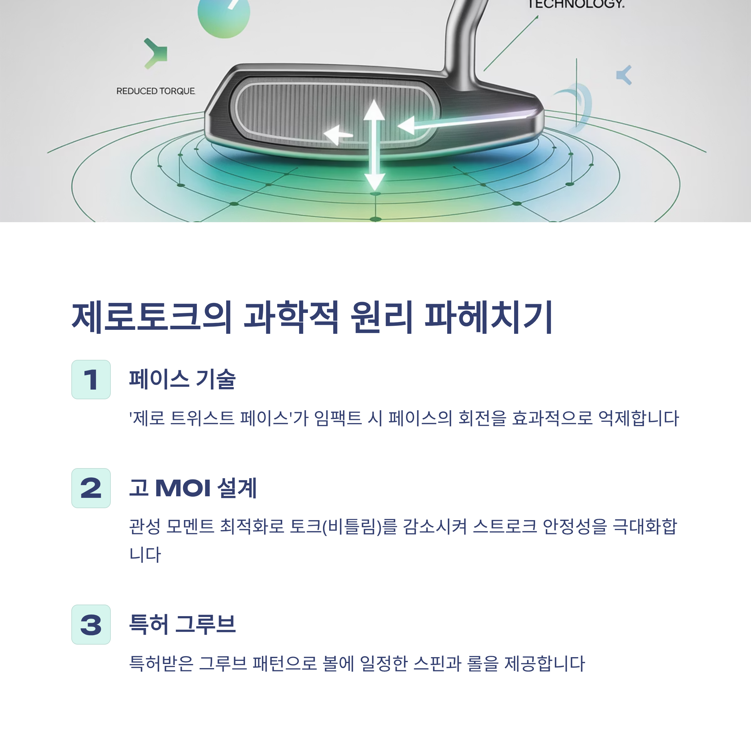 일반 퍼터는 오프센터 히트 시 헤드가 뒤틀리면서 방향성이 흔들리잖아? 😵💫 제로토크 퍼터는 이 문제를 뿌리부터 해결했어! 핵심은 MOI(관성모멘트) 극대화와 무게중심 최적화야. 정적 토크 밸런스와 동적 토크 밸런스를 동시에 구현해서, 정지 상태뿐만 아니라 스트로크 중에도 페이스가 스퀘어를 유지해. NASA급 기술이 골프에 적용된 거라고 생각하면 돼! 과학과 스포츠의 완벽한 만남이지. 이제 손목 움직임이나 스트로크 실수를 퍼터가 알아서 보정해주는 시대가 온 거야.