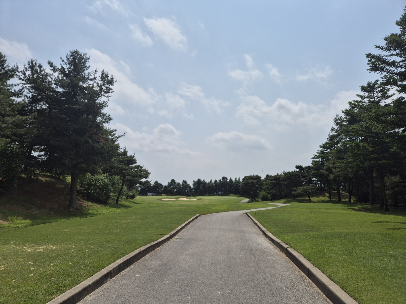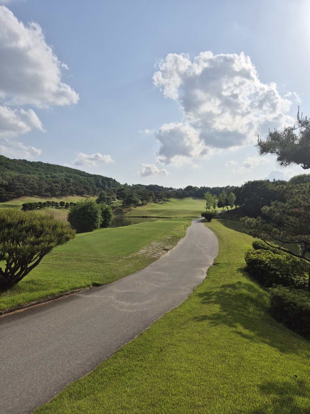 잔잔한 하늘 아래, 페어웨이를 감싸 안은 구불구불한 길.