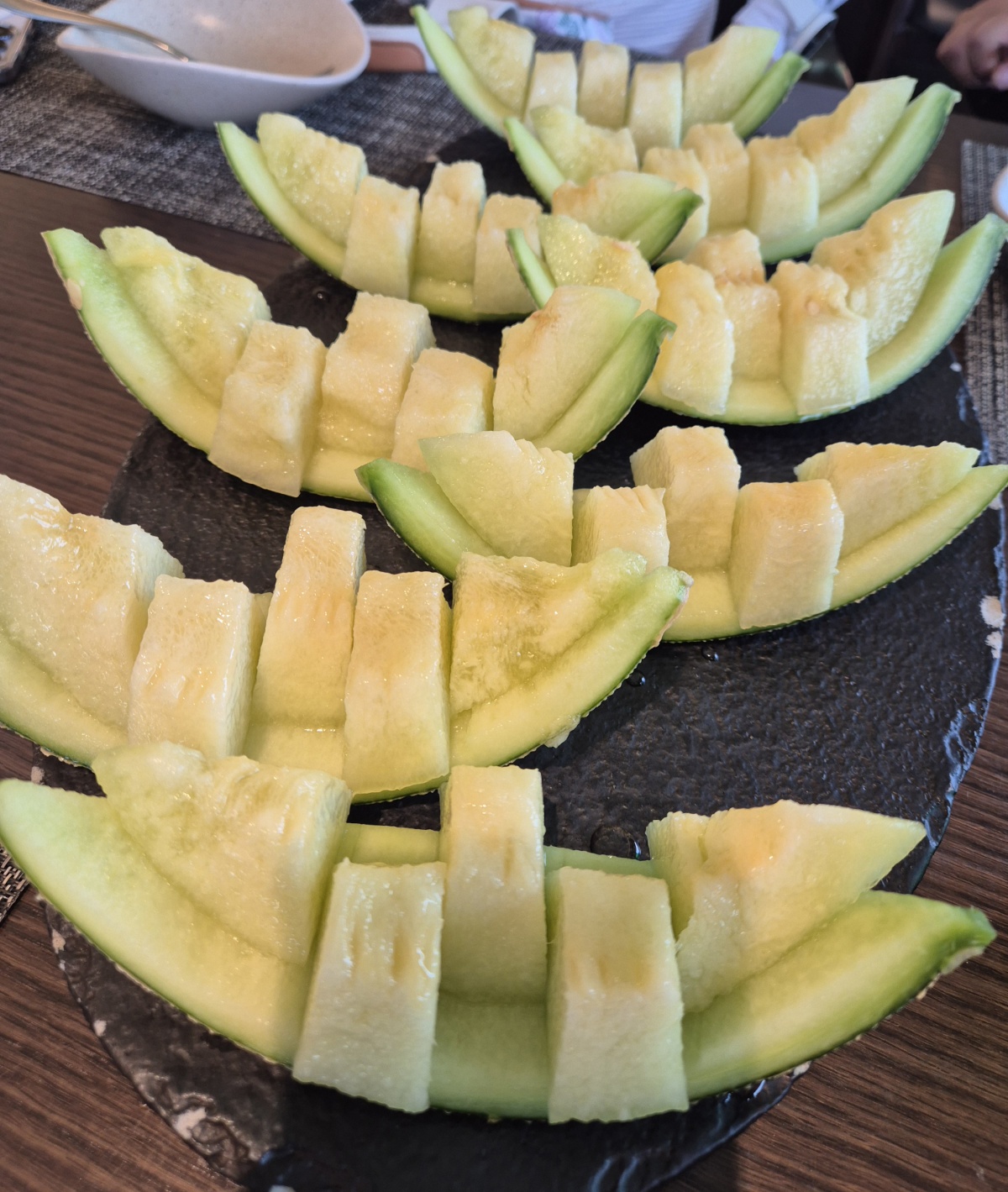 예쁘게 썰린 멜론들이 가지런히 놓인 이 한 접시.